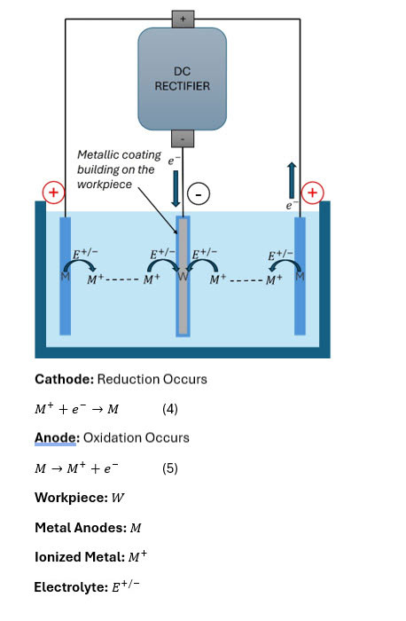 There are a myriad of different electrochemical metallic deposition methods that we could talk about. In some cases, electrolytic reduction or electroplating is the only method available to obtain and purify active metals [1]. For simplicity, let’s describe a generic plating solution as a water-based solution containing an electrolyte. An electrolyte typically consists of salts or a mixture thereof, serving as a ‘charge carrier’ or facilitating the flow of charge through the solution. Another perspective is to view the electrolytic solution as a conductor with inherent resistance, which varies with its composition and temperature, through which current flows. This flow is directed by an electric field introduced by the rectifier through the electrodes. The Anode, connected to the positive (+) terminal on the rectifier, represents the oxidation side of the reaction, characterized by localized positivity. Oxidation is an electrochemical process in which a metal atom loses an electron, becoming a cation. This is facilitated by the electrolyte balancing the valance electronic charge of the newly formed metal complex dissolved in solution. Completing the circuit, the Cathode, connected to the negative (-) terminal, facilitates the reduction of metal cations into a plated metal surface on the workpiece, characterized by localized negativity. Reduction is the process by which a metal ion gains an electron, reducing its charge back to zero.